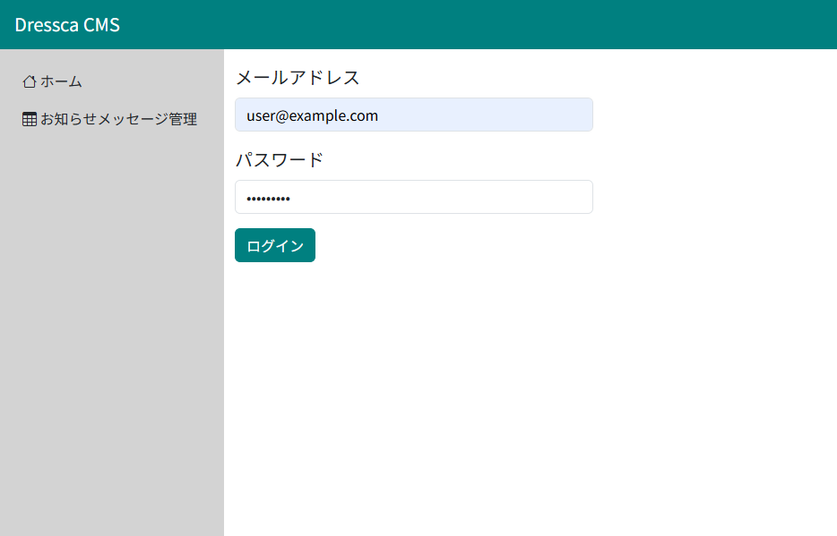 Dressca-CMS は、 Spring Framework / Spring Boot をベースとした CMS システムです。 画面に表示される HTML は Thymeleaf によりサーバーサイドでレンダリングされており、各操作は HTTP リクエストに基づくページ遷移型の画面構成として実装されています。 サンプルアプリケーションでは、ログイン機能に加え、認証済みユーザーがお知らせメッセージを管理するための一連の機能(一覧、登録、更新、削除)が実装されています。